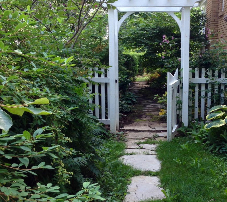 Have finished my informal Japanese garden path along the side of the house.  It is made up of larger and smaller stones set in a winding pattern and a bit bumpy in order to slow the stroller so one can appreciate the garden more.Informal Japanese path and photo of flagstone path leading through the gate to the japanese path http://www.gardengraces.ca Continue reading Garden Path