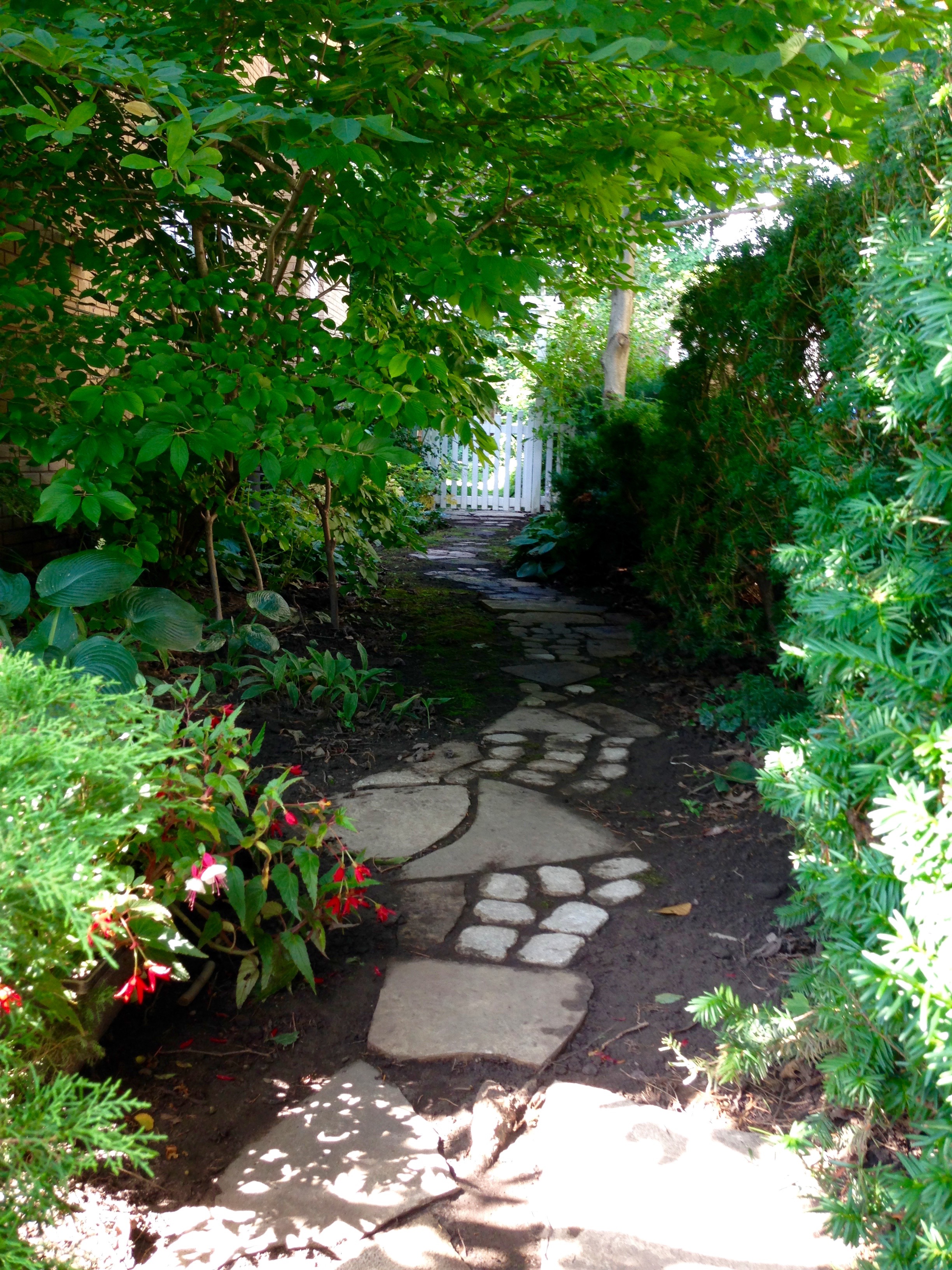 Have finished my informal Japanese garden path along the side of the house. It is made up of larger and smaller stones set in a winding pattern and a bit bumpy in order to slow the stroller so one can appreciate the garden more.