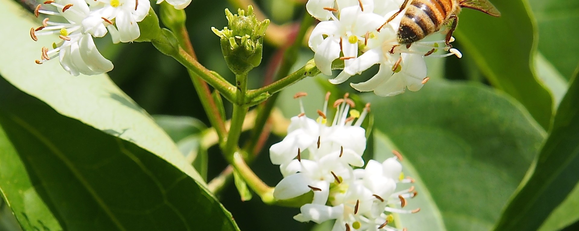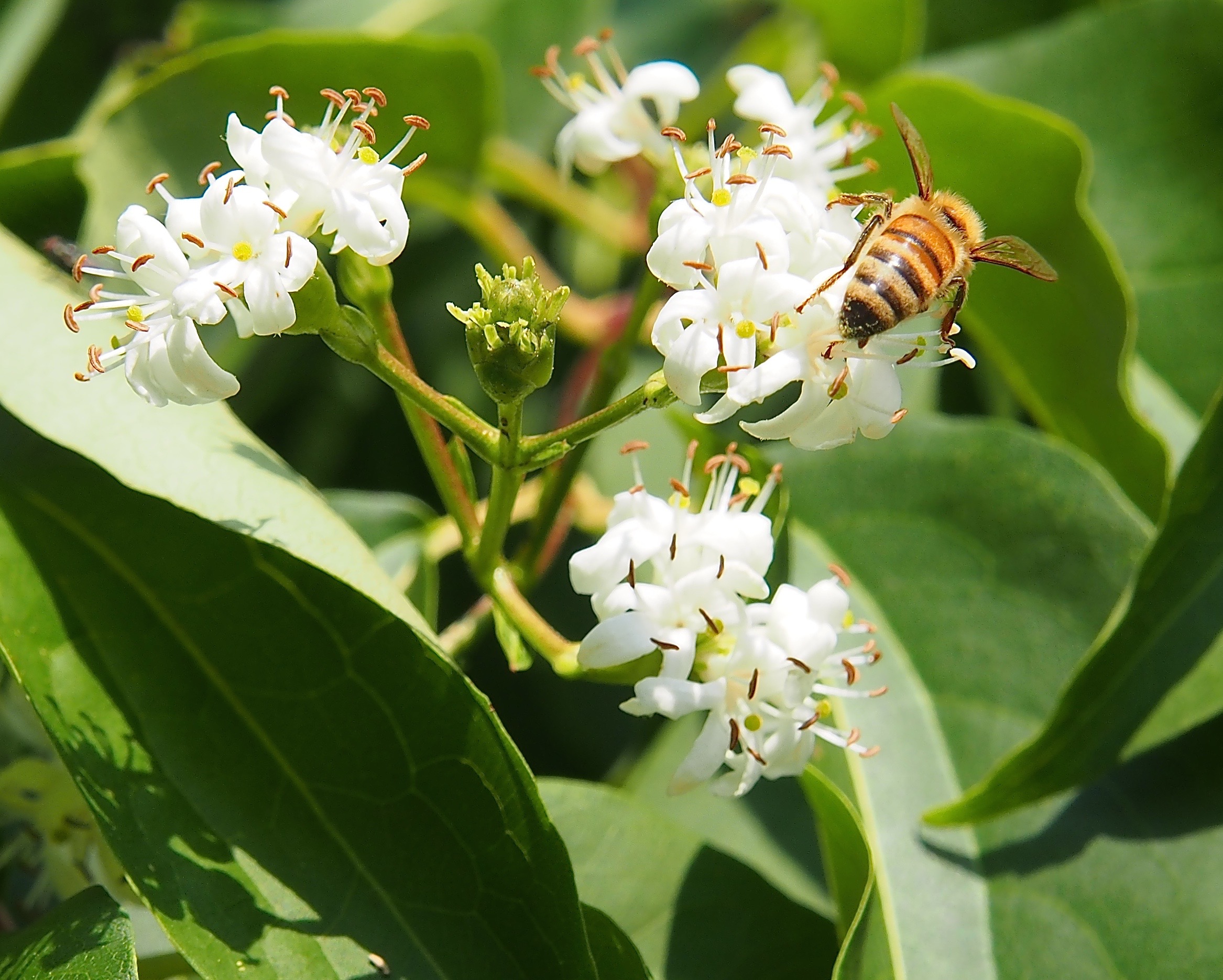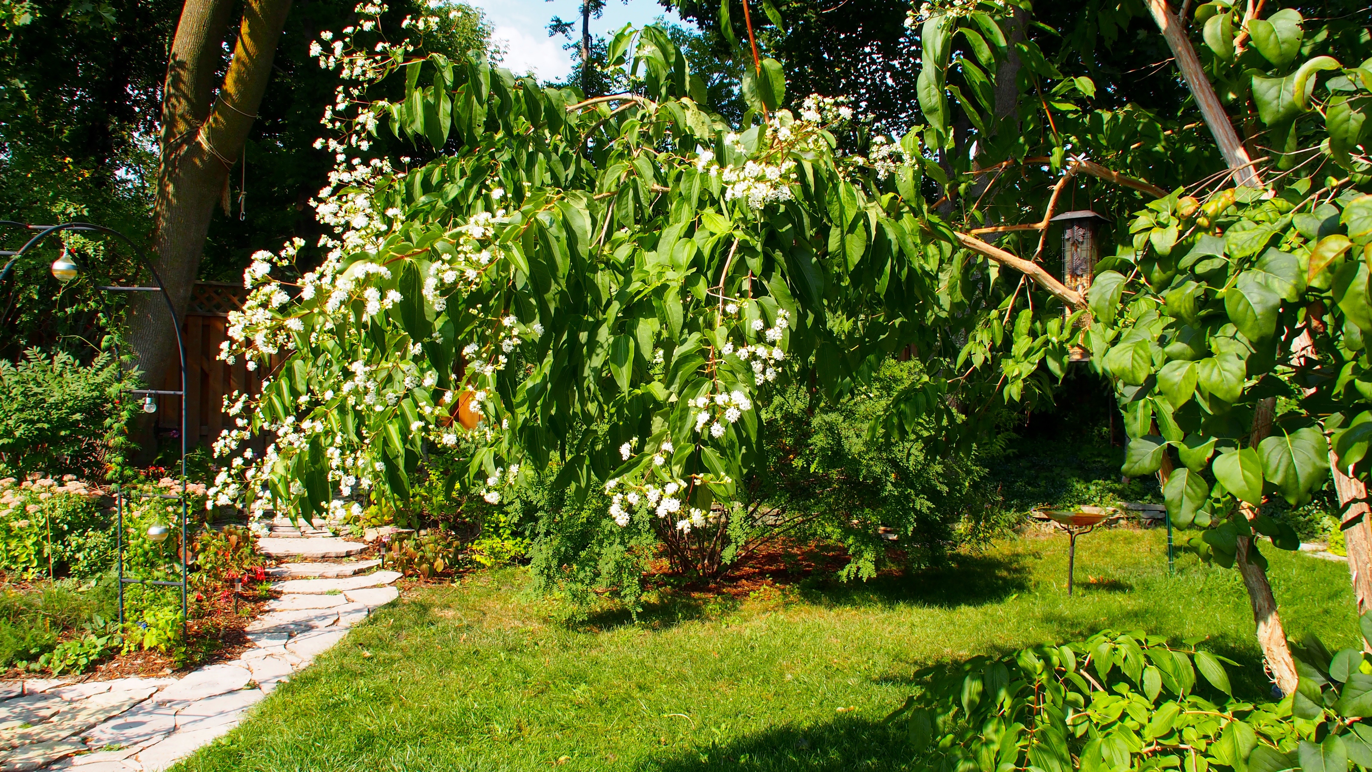 A wonderful large shrub or small tree for now is Heptacodium miconioides or seven-son flower. It flowers from August to October, bearing clusters of tiny fragrant white flowers. The bark shreds, giving winter interest and the shrub forms an open slightly tiered effect. Fall colour can be muted but the calyces, the bits left over after the flowers are done, turn a bright reddish pink. Another bonus is that honeybees absolutely adore this shrub so if you are concerned about your local bee population, definitely plant one of these.