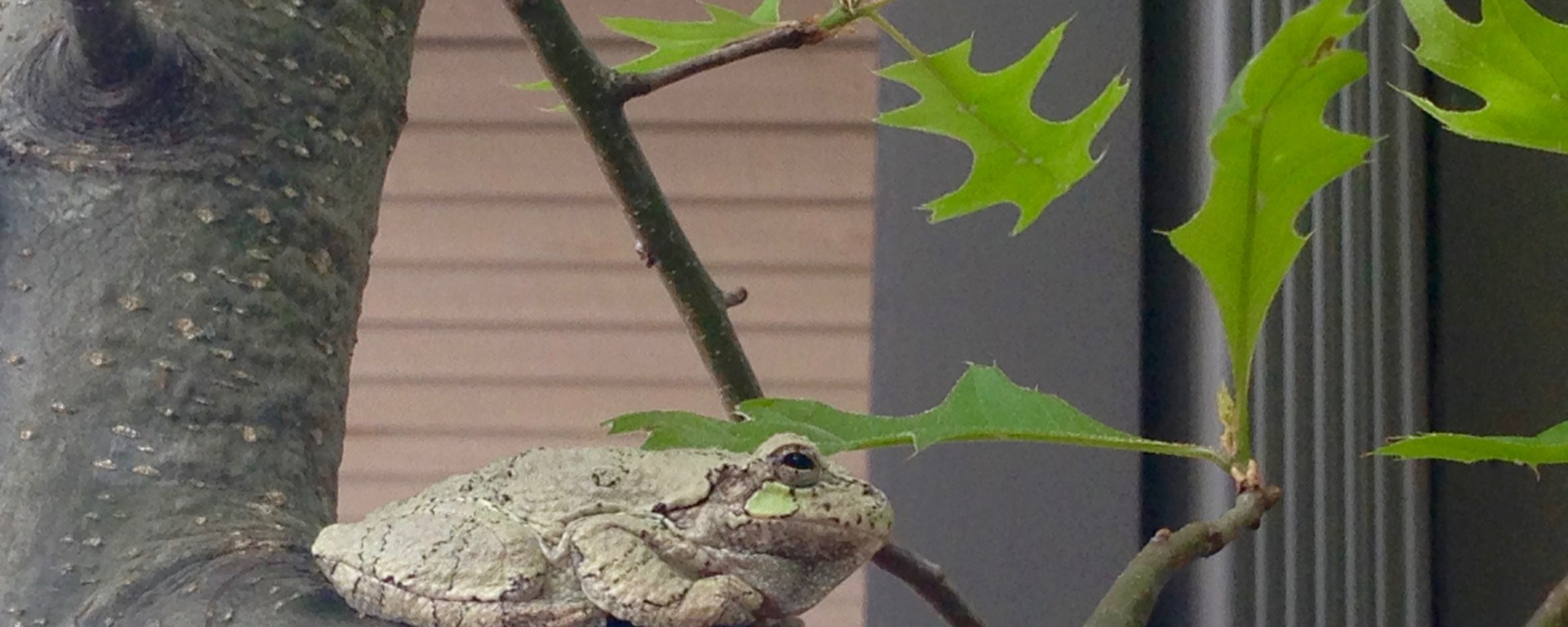 I found this little guy in an oak tree at Sheridan Nurseries, Georgetown. He’s a gray tree frog and was singing his little lungs out until I showed up. Then he made like a piece of lichen, very convincing 🙂