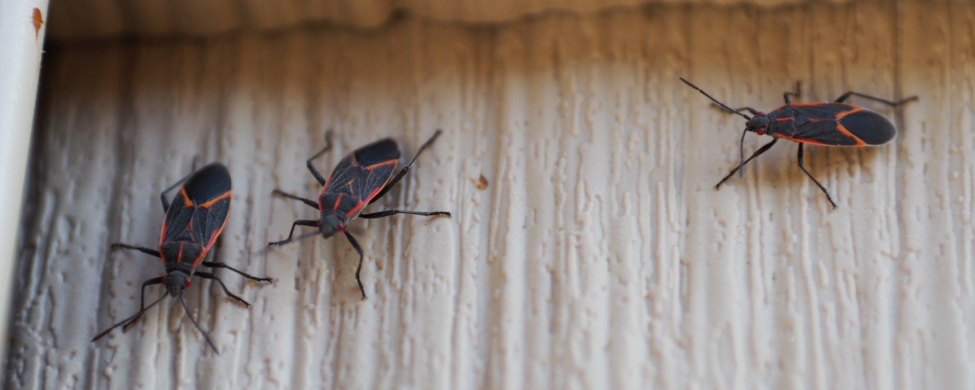 This past summer we have seen a number of red and black bugs flying about but recently there’s been a downright invasion! They are swarming any sunny wall and window and trying to get into our homes… What are they these buggy beasties? Well, they are known as boxelder bugs, quite natty looking with their red and black bodies and red wings. They are members of the true bug family, Rhopalidae, and are related to leaf hoppers, shield bugs and stink bugs